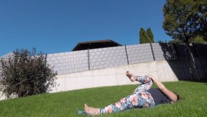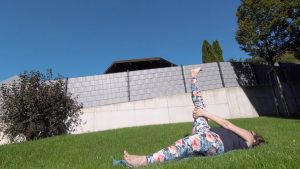 Das ist technisch sicher die einfachste Übung, dennoch kann sie sich ganz schön schwierig anfühlen. In der Rückenlage ziehst du zuerst das rechte Knie zum Bauch. Das linke Bein lässt du währenddessen locker auf der Matte liegen. Wenn das zu viel Spannung im Rücken oder der hinteren Oberschenkelmuskulatur erzeugt, kannst du den linken Fuß auch aufstellen. Wenn es dir schwer fällt, das Bein in der Hüfte zu beugen und das Knie zu strecken, weil dann die hinteren Oberschenkelmuskeln zu ziehen beginnen, kannst du auch einen Gurt verwenden. Du legst den Gurt um den Fuß, hälst ein Ende in der linken, ein Ende in der rechten Hand, streckst das Knie so weit wie möglich aus und variierst mit Hilfe des Gurtes die Beugung in der Hüfte. Dabei darf es hinten im Oberschenkel dehnen bis ziehen, aber nicht Schmerzen. Auch sollten die Muskeln nicht zu zittern beginnen, auch das ist ein Zeichen, dass du deine Dehngrenze überschritten hast. Übrigens dehnst du in dieser Asana den Psoas der am Boden liegenden Körperseite und die hintere Oberschenkelmuskulatur des nach oben gestreckten Beines.